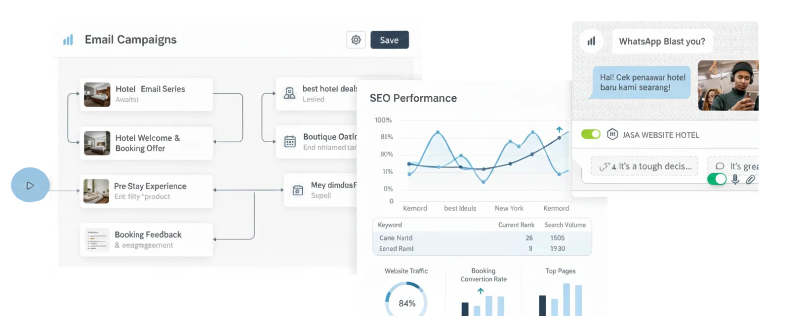 [GAMBAR: Screenshot dashboard dengan grafik pertumbuhan leads, email performance, dan ranking SEO]