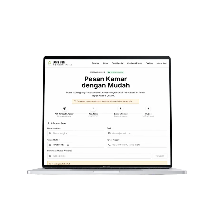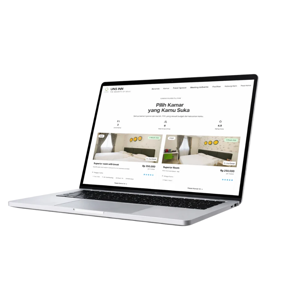 Hotel Unsinn Solo sudah memiliki website, namun hanya berupa landing page sederhana tanpa fitur booking online. Tamu harus menghubungi via telepon atau WhatsApp untuk reservasi.