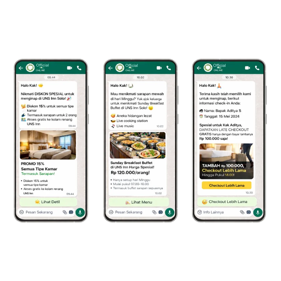 Sistem broadcast WhatsApp untuk promosi, penawaran khusus, dan follow-up tamu yang pernah menginap.
