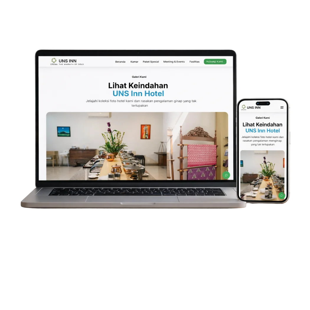 Transformasi digital Hotel Unsinn Solo dari landing page sederhana menjadi website hotel profesional dengan booking engine terintegrasi dan sistem WhatsApp blast marketing.